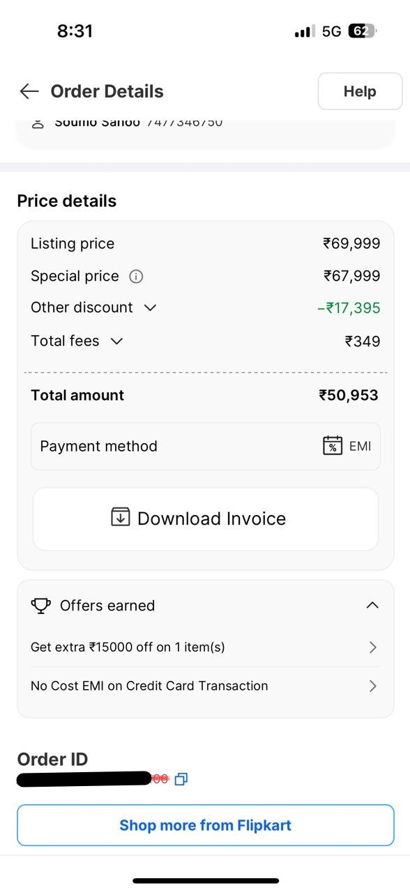 Flipkart clearly shows āNo Cost EMI on Credit Card Transactionā, and my order amount is ā¹50,953.